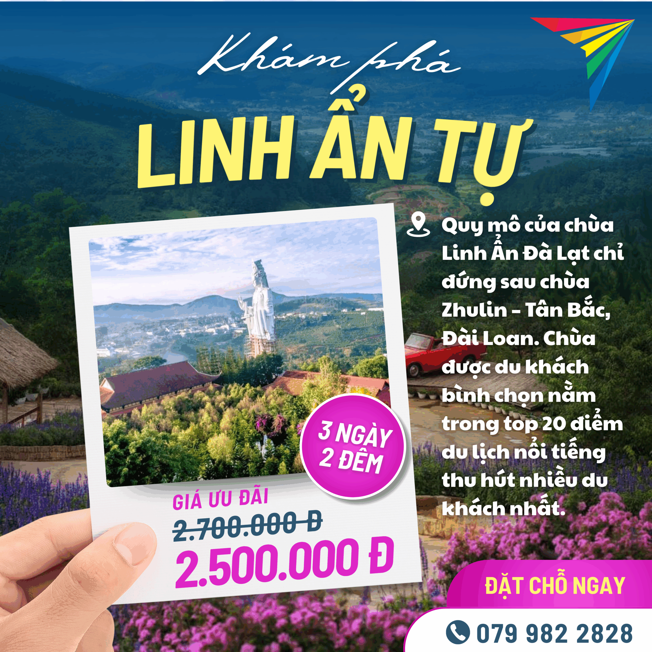 Trên đường về, đoàn sẽ dừng chân tham quan Linh Ẩn Tự – một trong những ngôi chùa lớn nhất Đà Lạt. Quy mô của chùa Linh Ẩn Đà Lạt chỉ đứng sau chùa Zhulin ở Đài Loan. Chùa được bình chọn nằm trong top 20 điểm du lịch nổi tiếng nhất Đà Lạt, thu hút đông đảo du khách trong và ngoài nước. Linh Ẩn Tự vừa là địa điểm tôn giáo vừa là điểm du lịch tâm linh hấp dẫn của Đà Lạt.